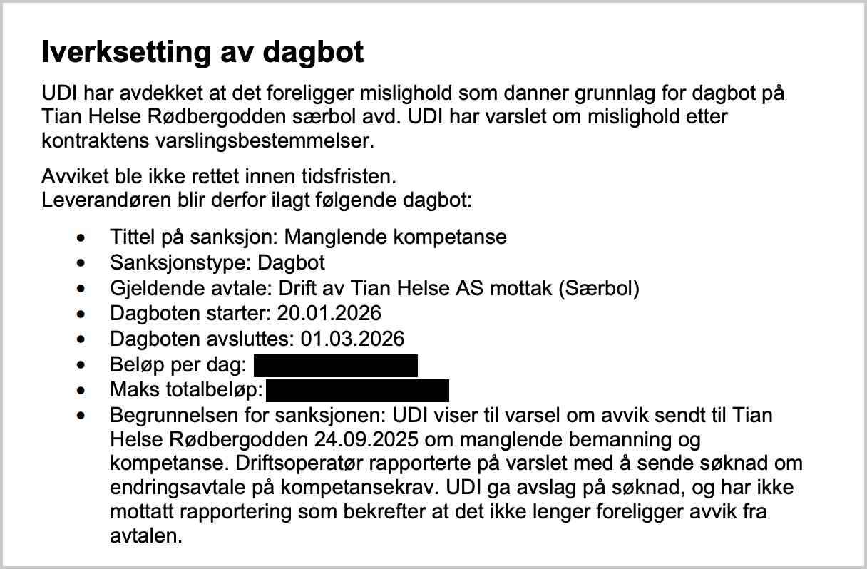 En måned tidligere blir Tian Helse AS varslet om at UDI anser leverandørkontrakten som misligholdt. Selskapet ilegges dagbøter. Ifølge UDI er grunnen at kompetansen og bemanningen ved institusjonen ikke er i tråd med avtalen. UDI varsler derfor enda en kontroll på stedet.