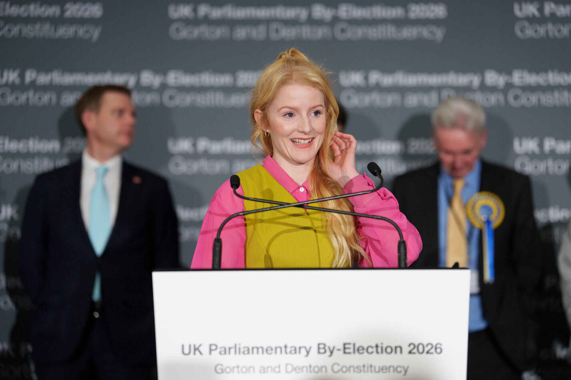 De Grønnes Hannah Spencer taler etter å ha vunnet suppleringsvalget i Gorton and Denton den 27. februar 2026. Foto: Jon Super / AP / NTB.