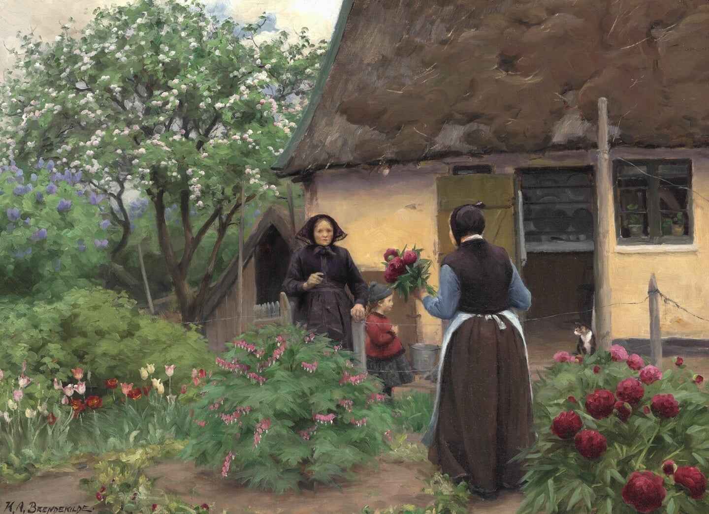 Hans Andersen Brendekilde valgte ofte landsbyhager som bakgrunn for sine motiver, og i denne hagen kan vi identifisere både blomstrende frukt-trær, peoner, løytnanthjerter og tulipaner. En eldre dame og en lille pige kommer på visit til en annen eldre dame. Hennes søster og et barnebarn eller en liten niese? Det er umulig å avgjøre nå. Den yngste damen ser ut til å ha fått øyekontakt med katten som sitter til høyre i døråpningen.