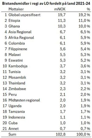 Følgende tabell viser hvordan bistandsmidler til LO er fordelt på ulike land.