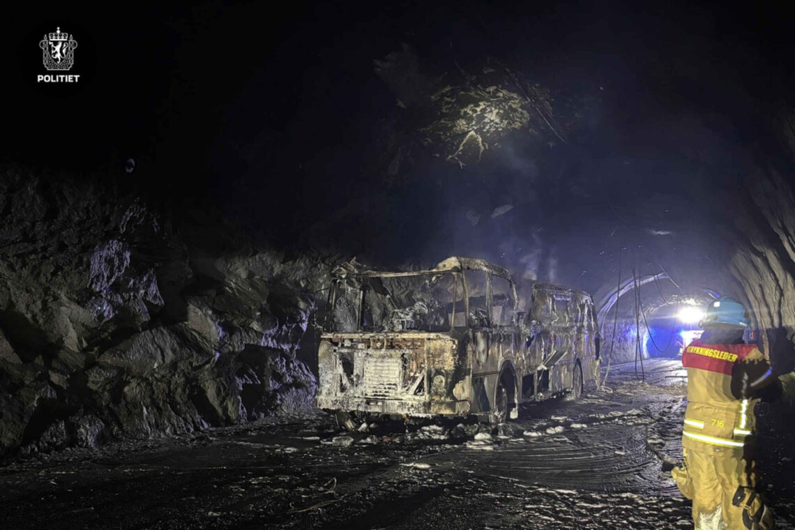 Politiet opplyste natt til fredag at bussen sto i brann om lag hundre meter inne i tunnelen, og at forbipasserende meldte at den var tom. Senere opplyste politiet at hele bussen og tunnelen var gjennomsøkt uten at det ble gjort funn av personer. Føreren var da ikke gjort rede for.
