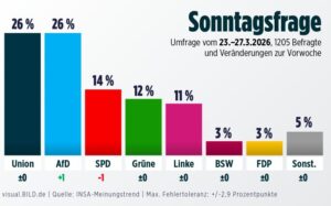 Ifølge en meningsmåling utført for Bild øker AfD sin oppslutning med 1 prosentpoeng og har nå en oppslutning på 26 prosent. Dermed ligger de likt med alliansen CDU og CSU til forbundskansler Friedrich Merz.