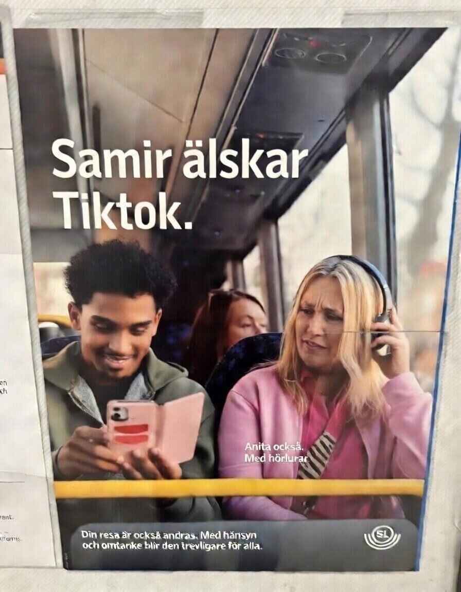 Plakaten viser en smilende, blond, middelaldrende kvinne – «Anita» – som sitter på bussen og ser på TikTok-videoer uten hodetelefoner. Ved siden av henne sitter en ung, mørkhudet mann – «Samir» – med hodetelefoner på hodet og et tydelig irritert ansiktsuttrykk.