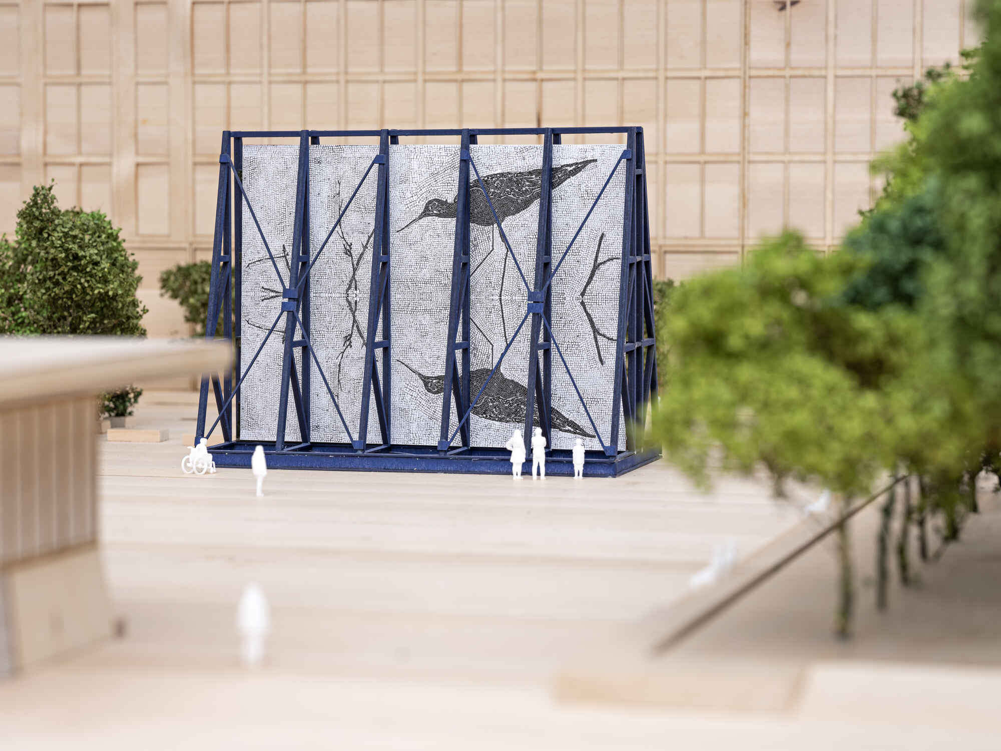 Matias Faldbakkens vinnerforslag baserer seg på å gjenoppføre riggen som ble tegnet og laget for å flytte og ivareta Pablo Picasso-verket «Fiskerne». Riggen vil han fylle med et nytt motiv: en monumental mosaikk med en tegning av en skjør, liten vadefugl som lever i Tyrifjorden ved Utøya, samt kvister og strå som speiler seg i vannet. Foto: Vegard Kleven / KORO.