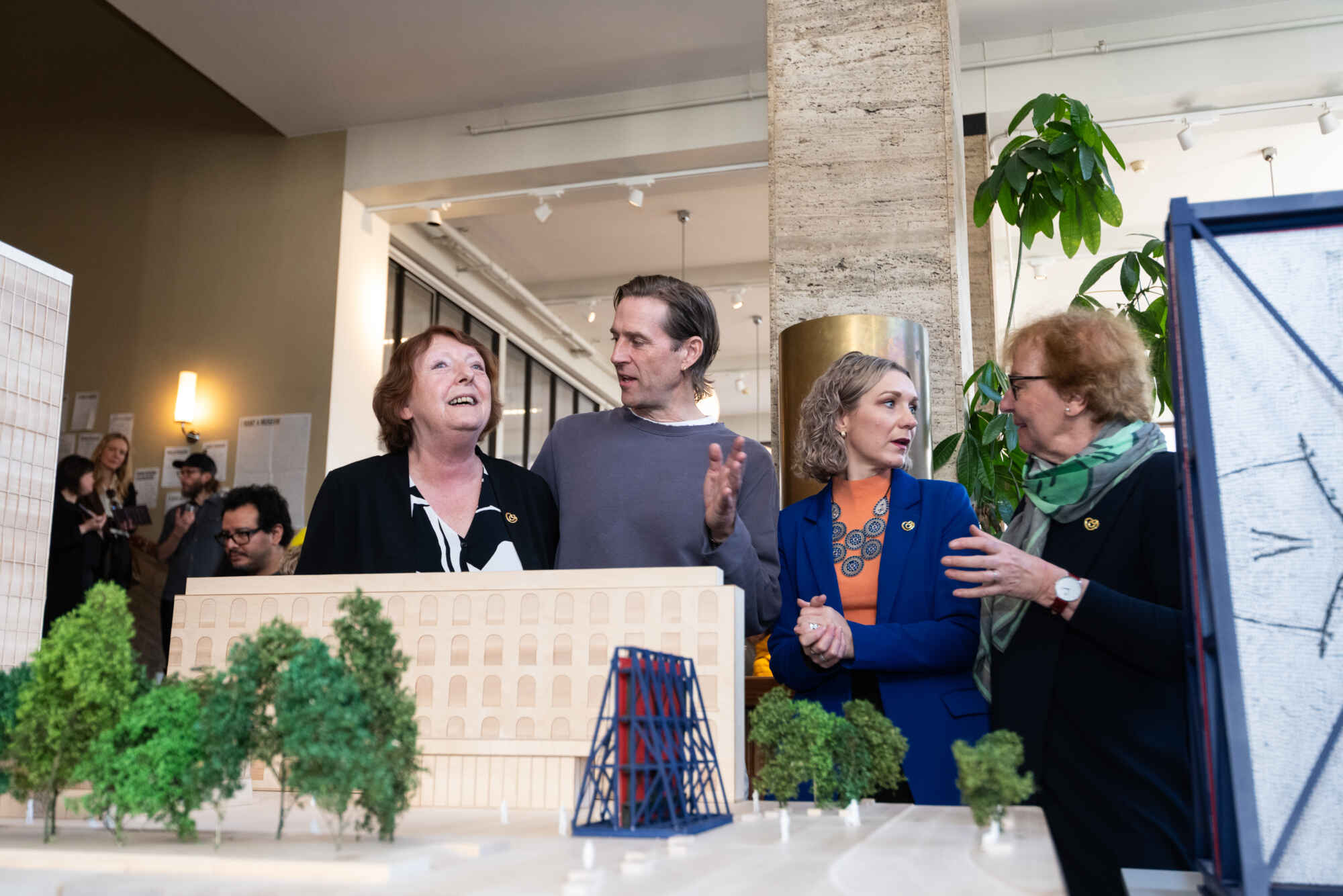 8. april offentliggjorde juryen hvilket minnested etter 22. juli de hadde valgt. Her er vinner Matias Faldbakken sammen med Lisbeth Kristine Røyneland (Den Nasjonale Støttegruppen for 22. juli), Karianne Tung (digitaliserings- og forvaltningsminister) og Marianne Borgen (juryleder). Foto: Niklas Hart / KORO.