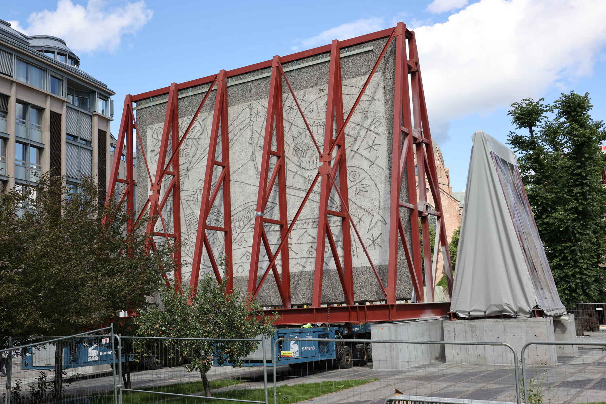 Kunstverket «Fiskerne» av Picasso flyttes til lagringsplass internt i Regjeringskvartalet i Oslo den 30. juli 2020. Sammen med «Måken» skal verket integreres i den nye A-blokken, en plassering regjeringen besluttet på anbefaling fra forvaltningsorganet Kunst i offentlige rom (KORO) i samråd med Picasso-administrasjonen. Foto: Ørn E. Borgen / NTB.