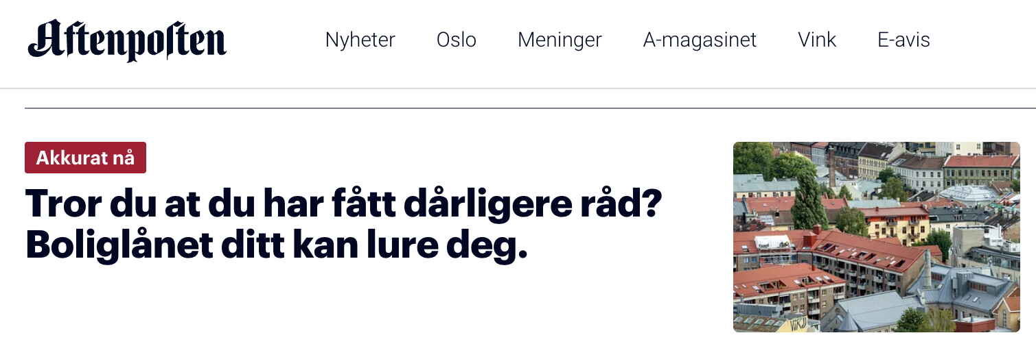 Så hvordan går det med denne informasjonen når NTB lager en sak om rapporten? Den forsvinner: «SSB-rapport: Folk har ikke dårligere råd – selv om det føles slik», lyder overskriften. Og Aftenposten gir NTB-saken god synlighet på forsiden. Du er lurt av lånet ditt, dummingen:
