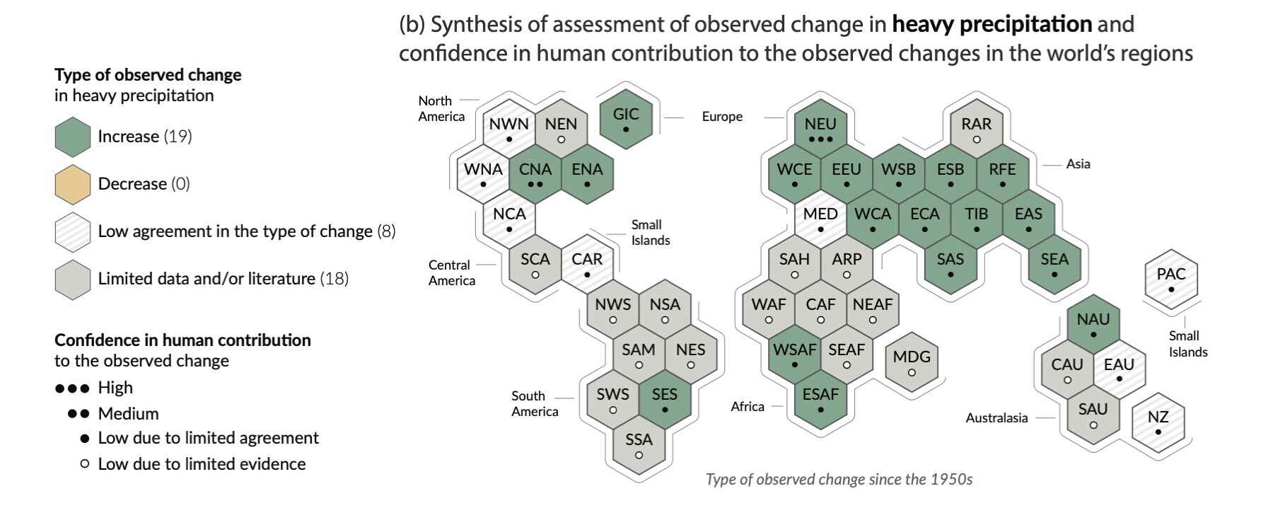 Et godt eksempel på hvor svakt det globale datagrunnlaget er for å trekke bastante slutninger om klimautvikling, er det de skriver om styrtregn. Her er det å bemerke at 26 av de 45 områdene IPCC har delt inn verden i med hensyn til klima, mangler data til å trekke pålitelige konklusjoner, og av 7293 meteorologiske stasjoner i de 19 øvrige områdene viser 663 signifikant økning og 150 signifikant minskning. Dette betyr at 89 % av alle stasjonene ikke viser noen statistisk signifikant trend (kilde: AR6.WG1 Fig. 11.13). Og av utdraget nedenfor fra figur 3 i SPM med tittelen Klimaendringene påvirker allerede alle bebodde regioner i verden med menneskelig påvirkning på mange av de observerte endringene i vær -og klimaekstremer (min oversettelse), fremgår det at kun i Nord-Europa (høy konfidens) og i sentrale Nord-Amerika (middels konfidens) blir økningen i sterk nedbør knyttet til menneskelig påvirkning. I de 17 andre områdene konkluderer de med lav konfidens.