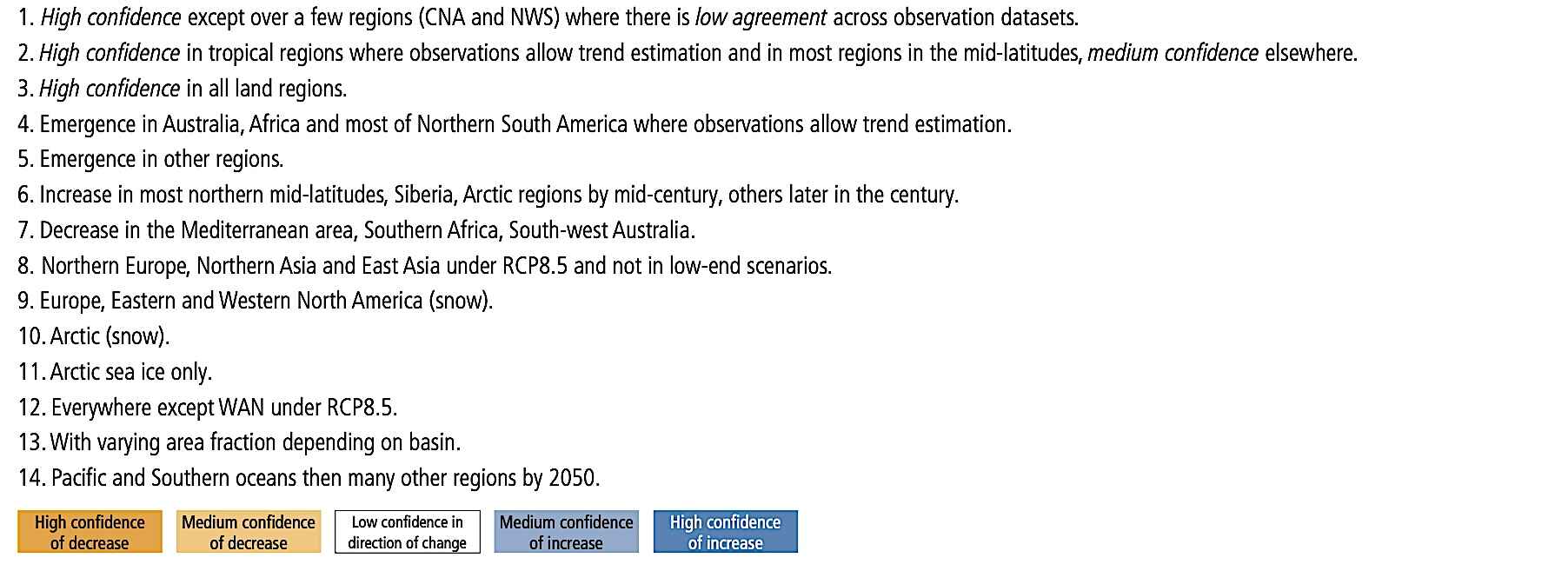 Det første som slår en ved lesning av tabellen, er alle de hvite cellene som angir lav konfidens for (liten tiltro til) endringer utover naturlige variasjoner både hva gjelder dagens klima og i simuleringer av klima gjennom resten av det 21. århundret. Påfallende er det at observerte endringer i styrtregn, tørke og tropiske sykloner som nevnes spesielt i SPM, i denne tabellen ikke vurderes til å gå ut over naturlige variasjoner, og at det heller ikke antas å ville inntreffe i løpet av det 21. århundret, bortsett fra styrtregn, som estimeres å inntreffe i Nord-Europa, Nord- og Øst-Asia mot slutten av århundret, basert på det totalt urealistiske RCP 8.5 og ikke lavere scenarier. Heller ikke gjennomsnittlig nedbør viser endring utover naturlige variasjoner, men IPCC antar slik endring fra 2050.