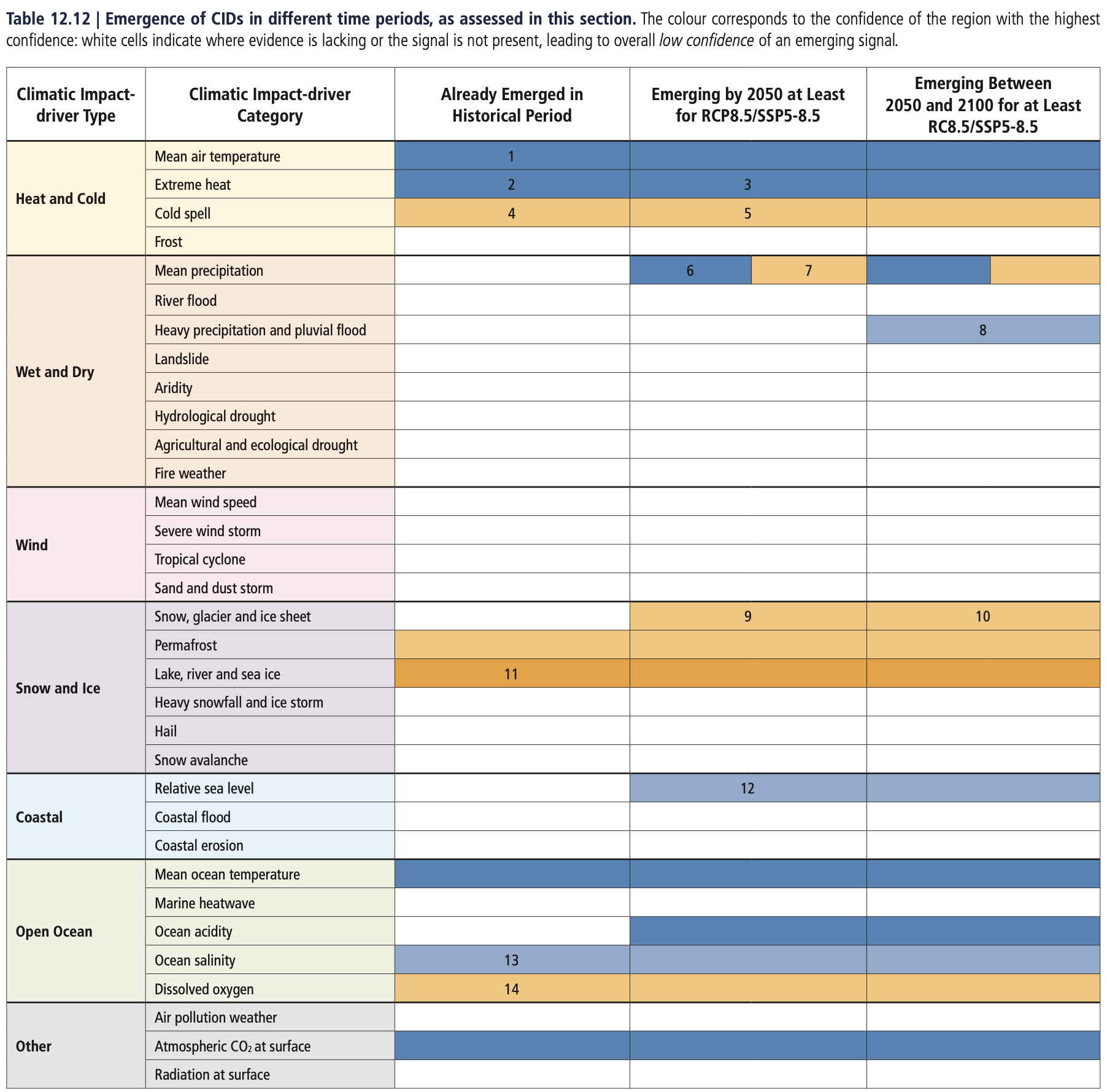 Dette kommer særlig til uttrykk i AR6 WG1 kapittel 12, hvor den oppsummerende tabell 12.12 på side 1856 (vist nedenfor) klart viser av mange av de værfenomenene som skal være tegn på klimaendringer, basert på meteorologiske data og klimamodeller, ikke kan påvises å ha hatt noen endringstrend utover naturlige variasjoner, og mange vil heller ikke vise noen endring gjennom resten av det 21. århundret, selv i det høyst usannsynlige modellscenariet RCP 8.5 (ledende forskere innenfor IPCC har karakterisert RCP 8.5 som helt urealistisk).