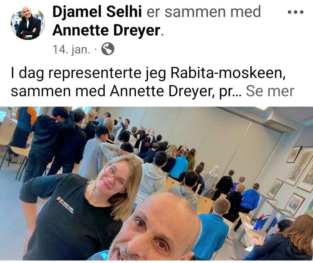 14. april i år var mandag i påskeuken, eller Den stille uke, eller Den hellige uke, som den også kalles. Vi vet ikke om det var det kristne budskapet som var av interesse for presten og moskeen. Annette Dreyer har, som flere prester og biskoper i Den norske kirke, en god del samkvem med moskemiljøet. Og hun har også besøkt Rabita-moskeen. Eller som Djamel Selhi skrev på Facebook i september 2023: «Hyggelig besøk av Annette Dreyer fra Haugerud menighet til Rabita moskeen.» Det sto ikke noe om hva de diskuterte eller la planer om.